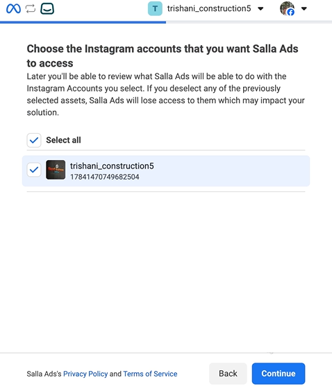 5. اختر حساب انستقرام المطلوب ثم اضغط (المتابعة).