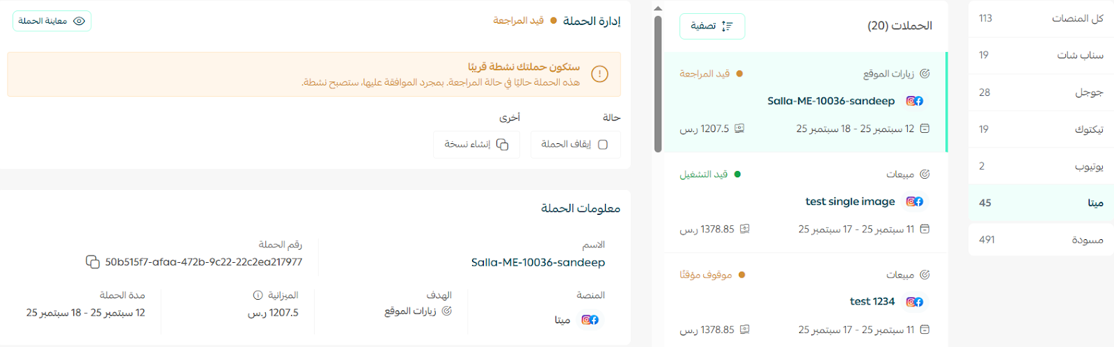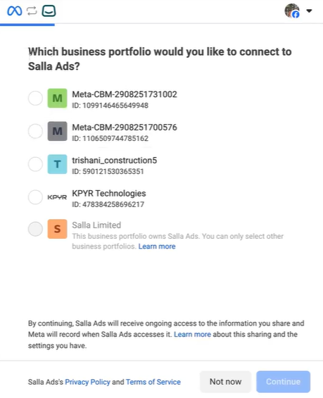 🚧 ملاحظة: يشترط وجود حملة سابقة على الأقل على إعلانات سلة لتتمكن من الربط بنجاح.