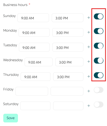 The final step when adding a branch or warehouse is setting Working Hours. Enable or disable the working hours as needed, then click Save.