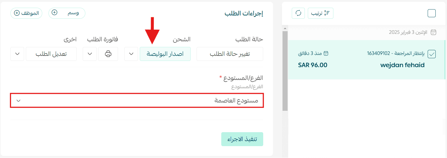 From the order details page, click Issue Shipping Label, select the branch or warehouse, then click Execute Action.