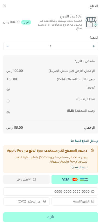 3. Enter the number of branches you want to add, choose your payment method, then click Confirm Payment.