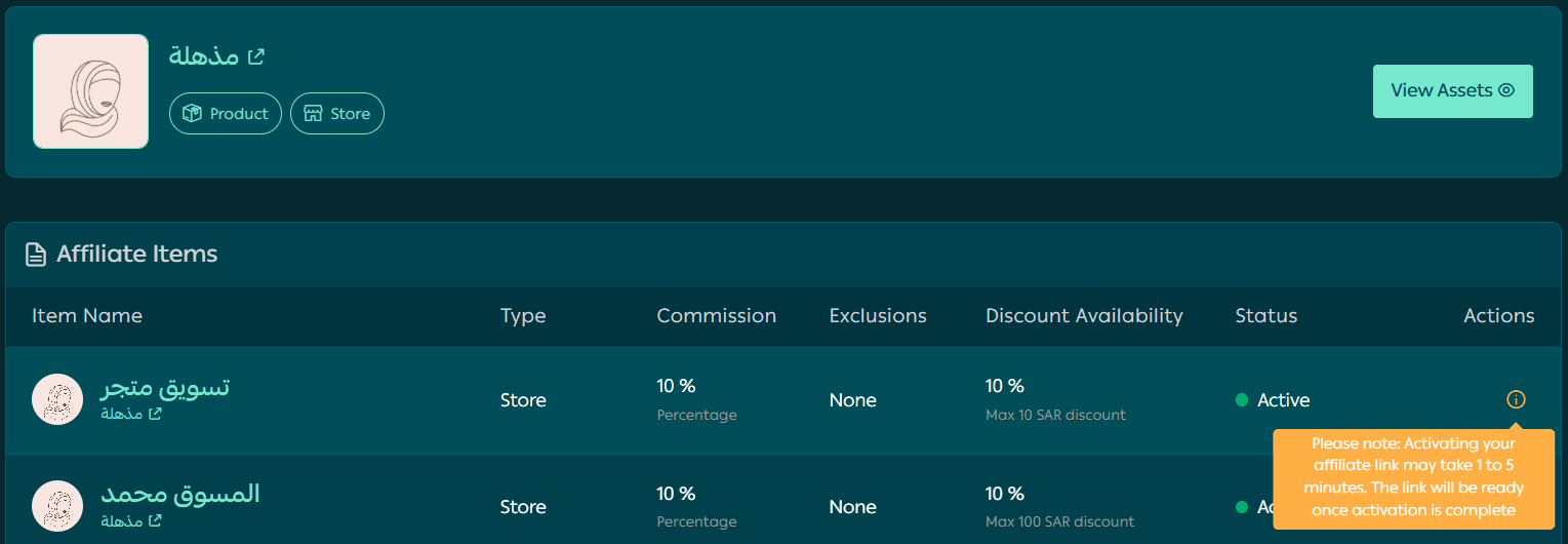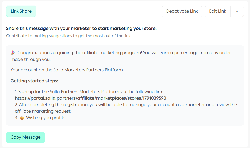 You can customize the message sent to the affiliate and share it through available channels, or copy it and send it however you prefer.