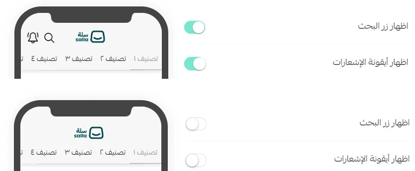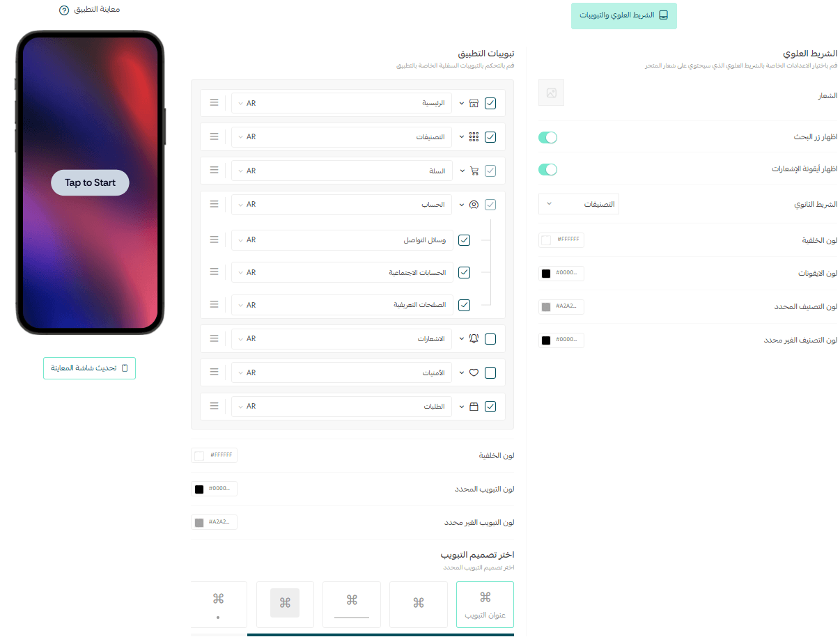 Once configured, the top bar and tabs will appear in your app exactly as selected, providing a clear, intuitive navigation experience that helps customers find products faster and interact with your store more easily.