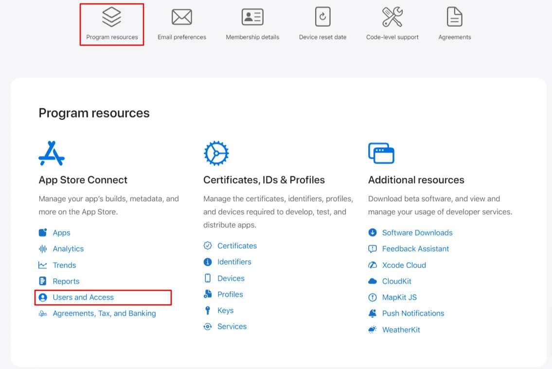 From Program Resources → App Store Connect, click Users and Access.