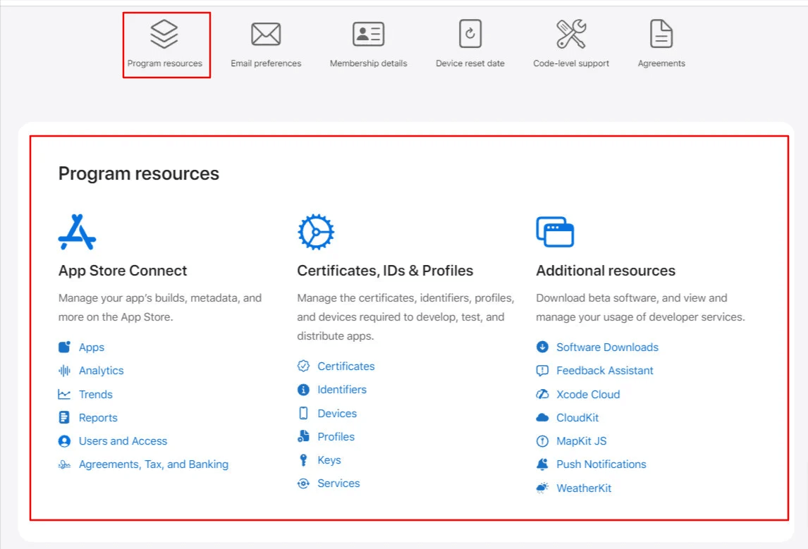 - Certificates, Identifiers & Profiles (available for Organization accounts only)