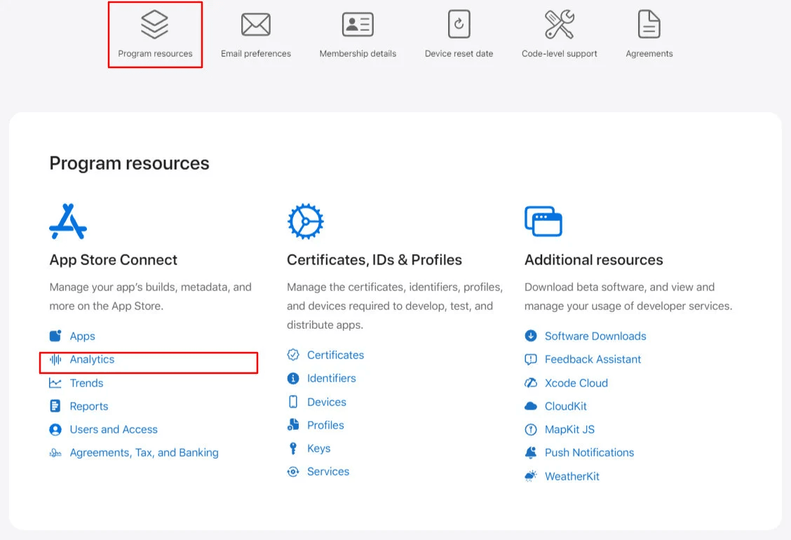 From Program Resources → App Store Connect, click Analytics.