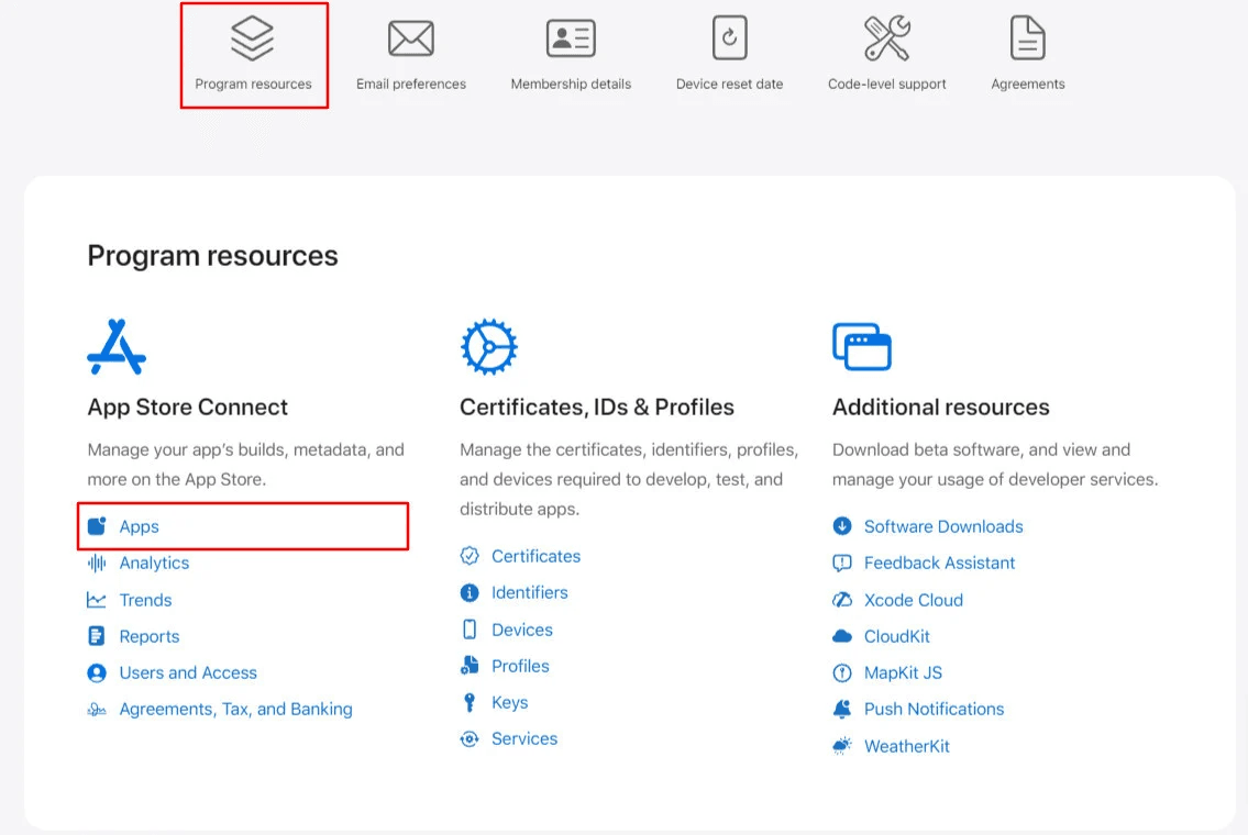 From Program Resources → App Store Connect, click Apps.