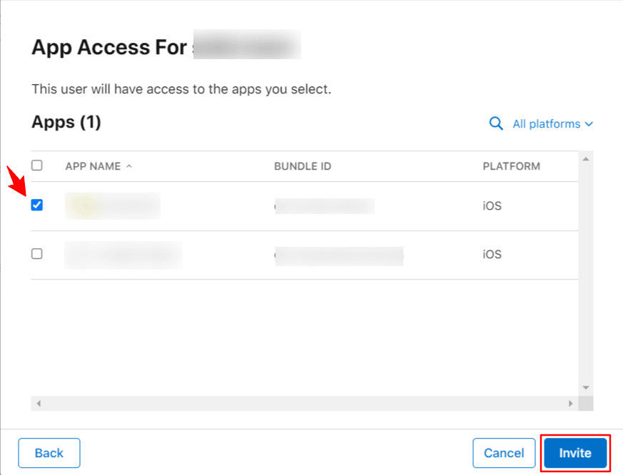 Select the apps the user can manage, then click Invite to send the invitation.