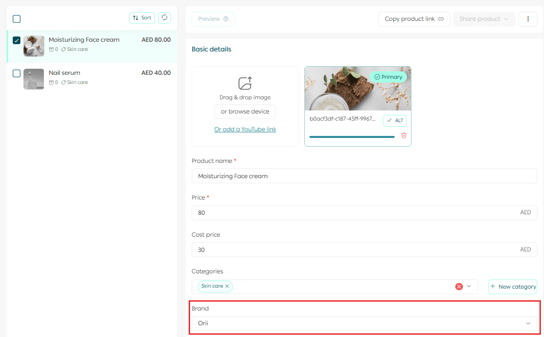 3. From the product’s basic information section, select the brand the product belongs to, then click Save.