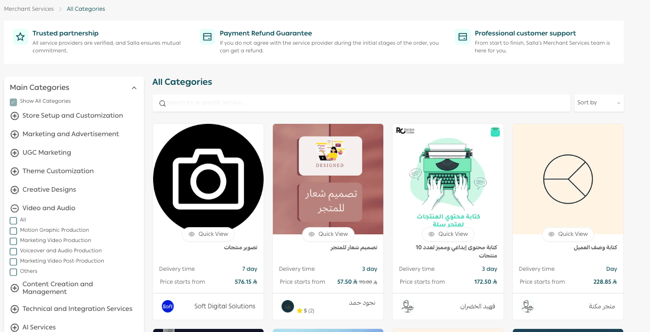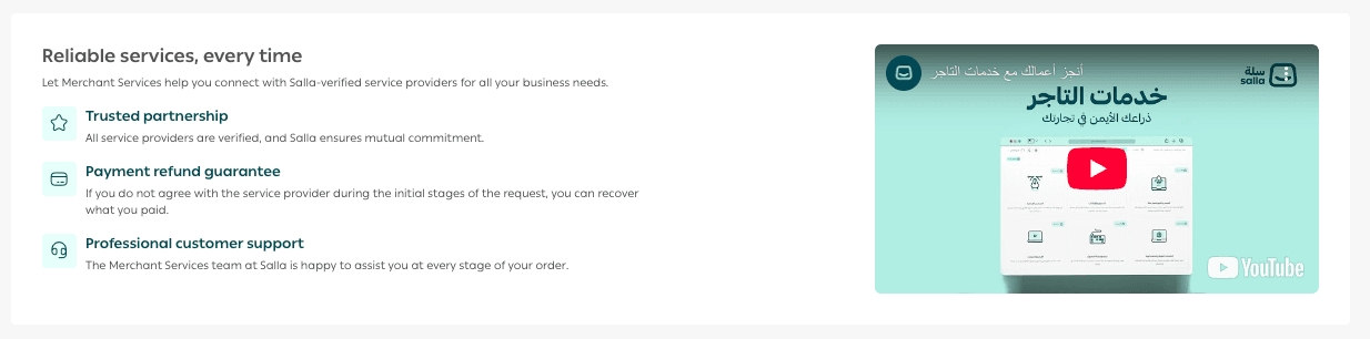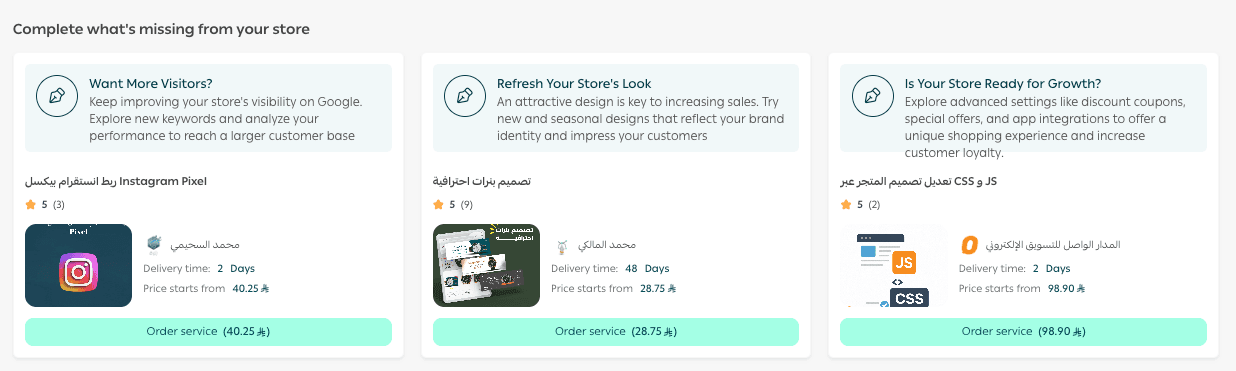 Under Complete what’s missing from your store, Salla suggests tailored services based on AI-powered store analysis, helping you identify what your store needs most right now.