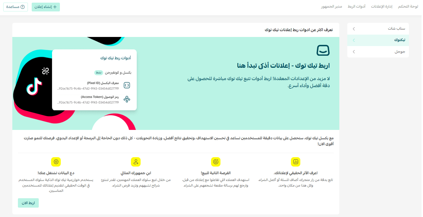 Do you find it difficult to track your campaign performance accurately or reach the right audience at the right time? The Integration Tools article is your practical guide to easily connecting advertising platforms such as Snapchat, TikTok, and Google with Salla Ads. These tools help you improve targeting, gain deeper insights, and maximize your advertising return.