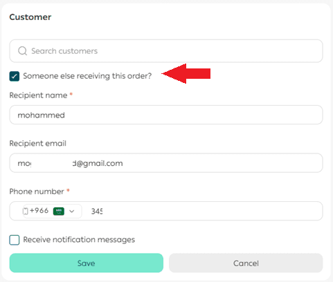 Enable the Send Order to Another Person option and enter the recipient’s name, email address, and phone number, then click Save.