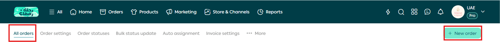From the main menu, click Orders, then open the All orders tab and click New Order.