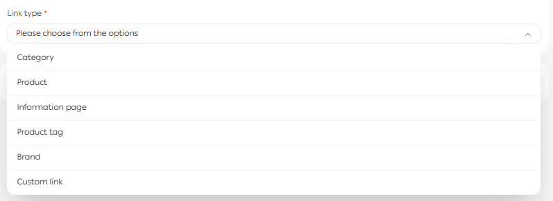 After selecting the link type, choose the destination page. This can be a product, category, informational page, or another supported page type.