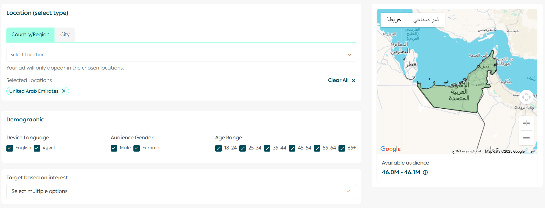 - Choosing the location (country, region, or custom geographic area)