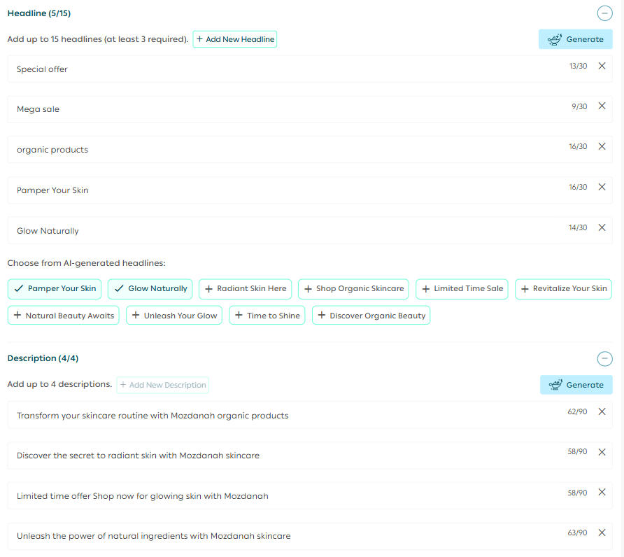 You can also use AI-powered suggestions to help generate headlines and descriptions.