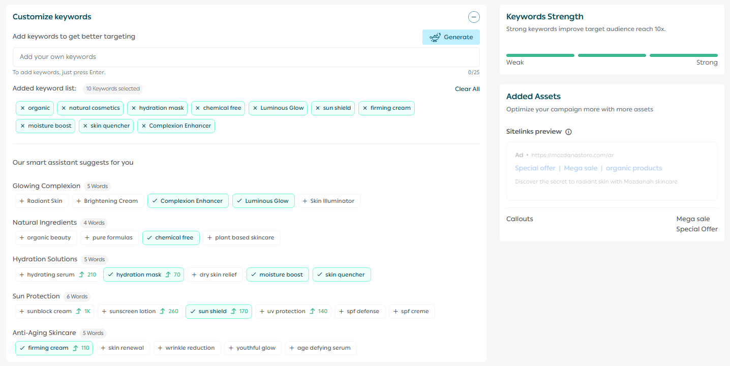 - Enter at least 10 keywords for the campaign