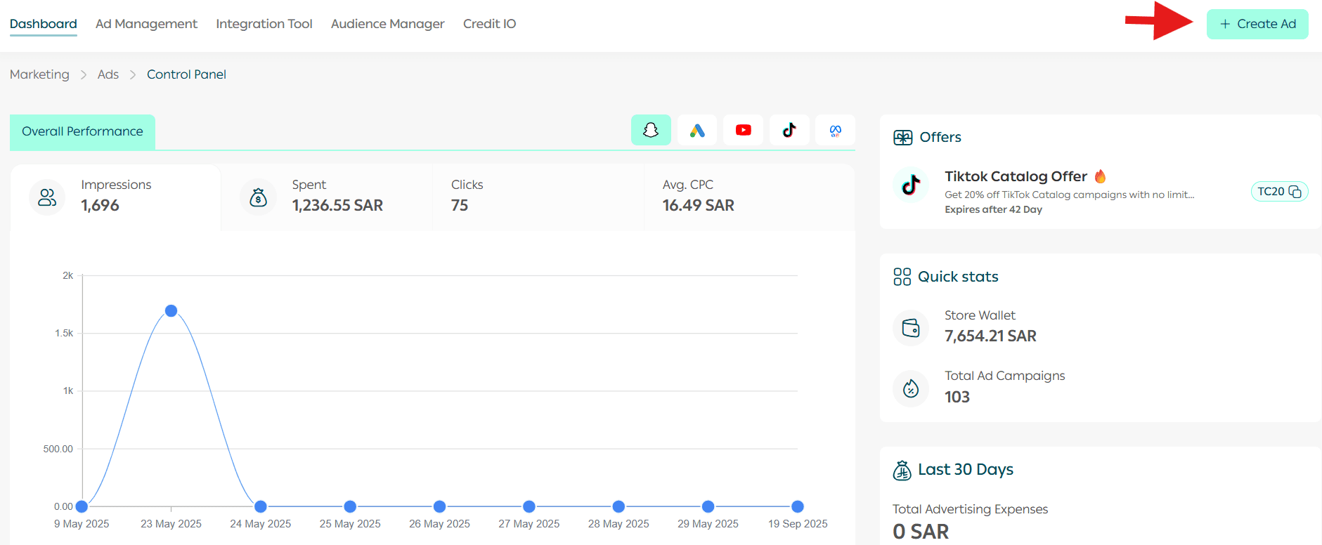 - From the Salla Ads page, click + Create Ad.