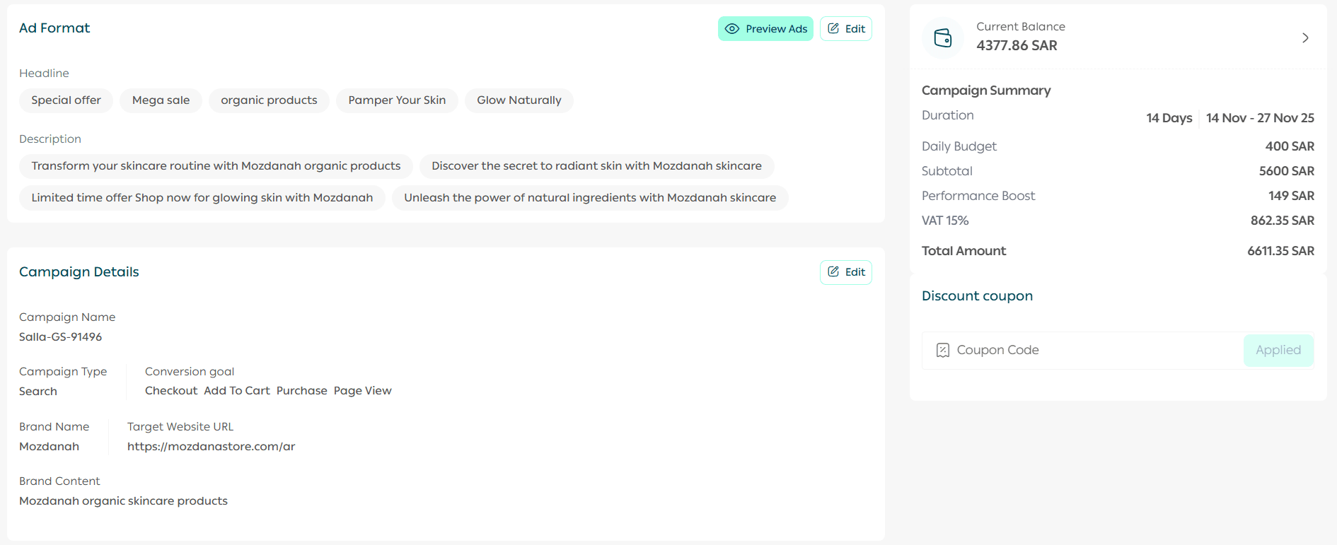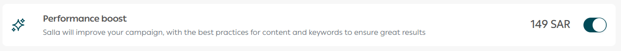 You may also enable Salla Ads optimization, allowing the Salla Ads team to apply best practices for content and keywords to enhance performance.