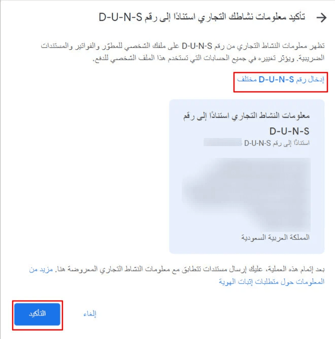 - Confirm the organization name (must match D-U-N-S data)