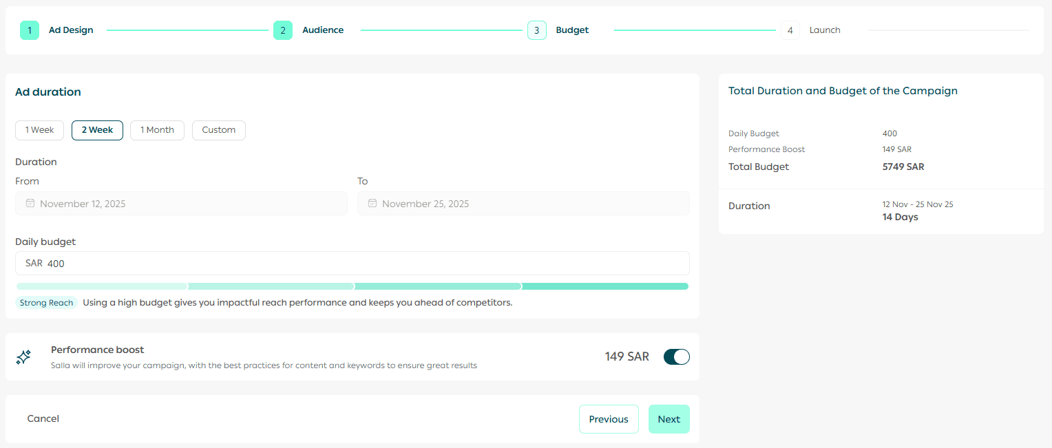 Note: When you enable Performance Boost, the Salla Ads team will optimize your campaign using best content practices to help achieve stronger results.