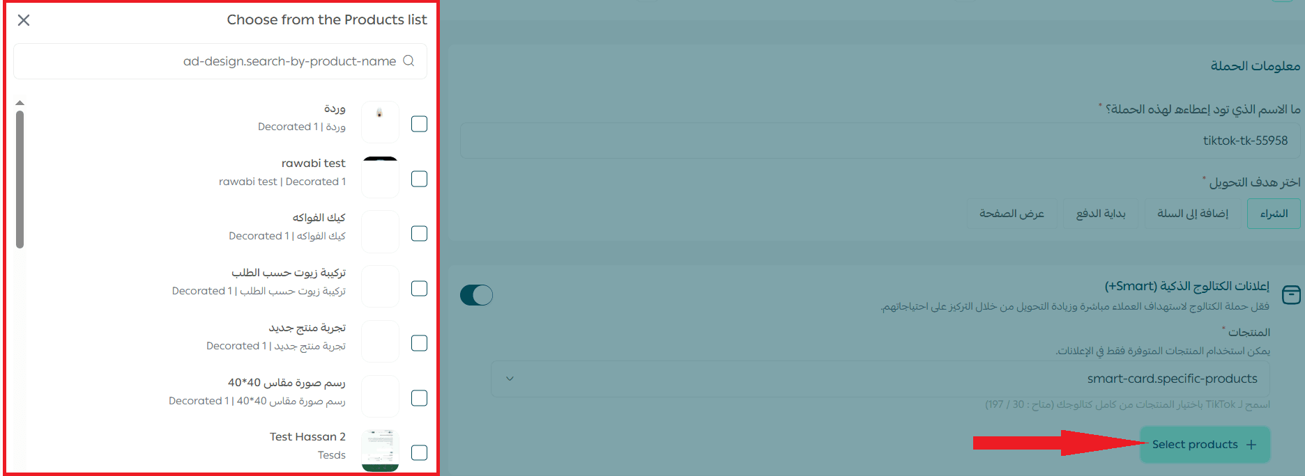 Note: Only available products can be used in ads. To select specific products, click Select Products, and a list of available products will appear.