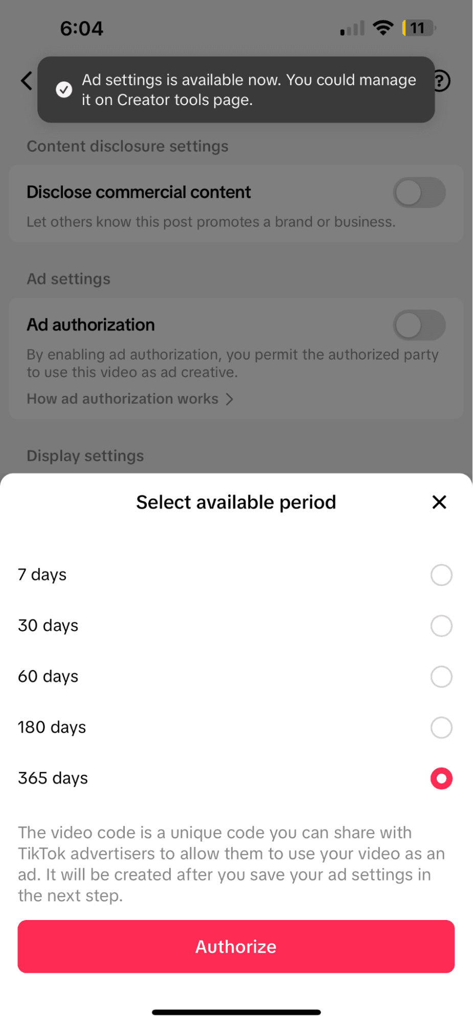 5. Enable Ad Authorization, choose the duration, and click Authorize.