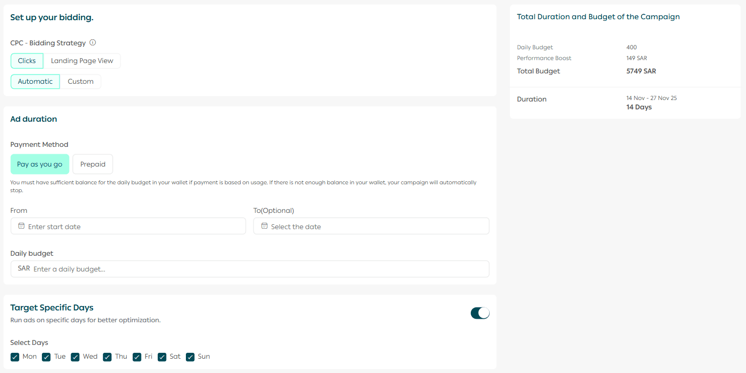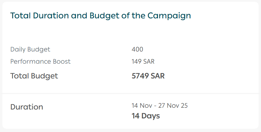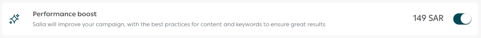 π Important Note: When enabling Performance Boost, the Salla Ads team will optimize your campaign using best practices and proven content strategies to achieve better results.