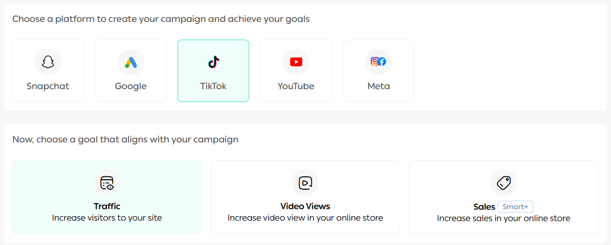 2. Select TikTok as the advertising platform, then choose your campaign objective.