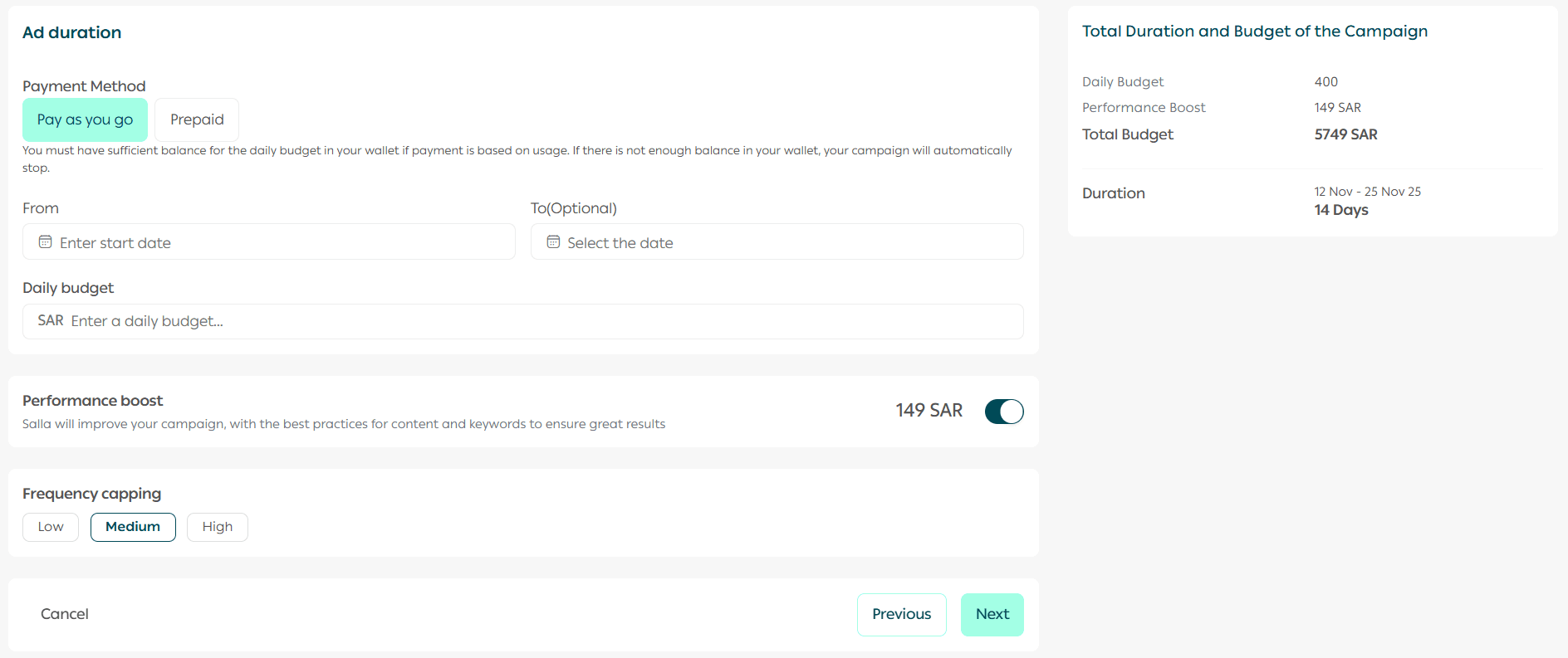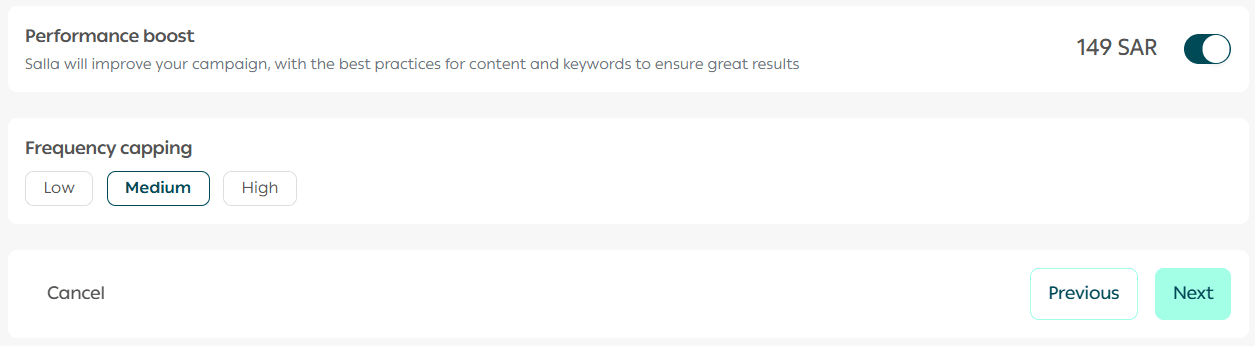 You can also choose whether to enable campaign optimization by the Salla Ads team, who will apply best practices for content and keyword selection to improve performance.
