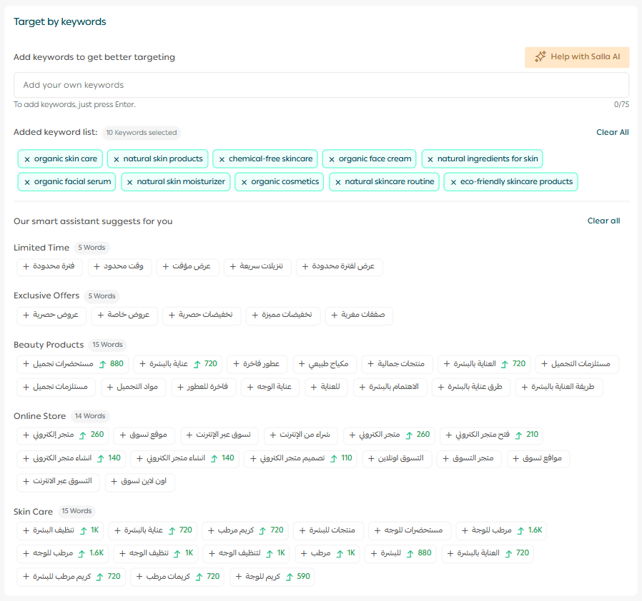 - Relevant keywords, with the option to use the Salla AI to identify high-performing keywords