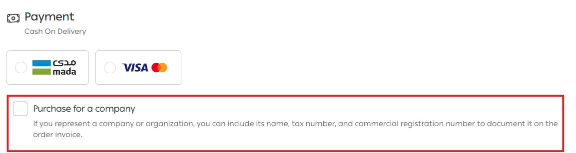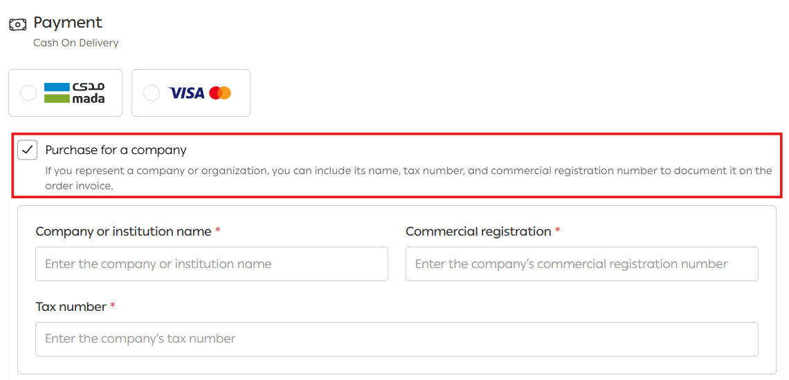 On the checkout page, the customer enables Purchase as a company, then enters: