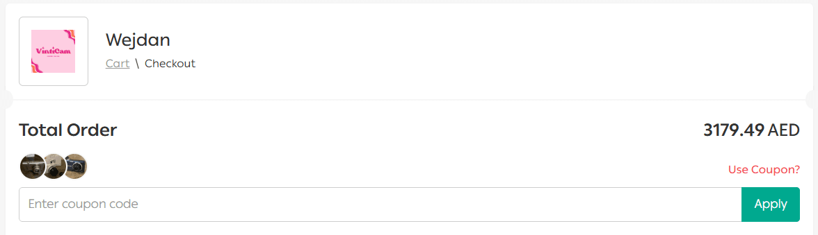 Below the order total, the customer enters the coupon code and clicks Apply.