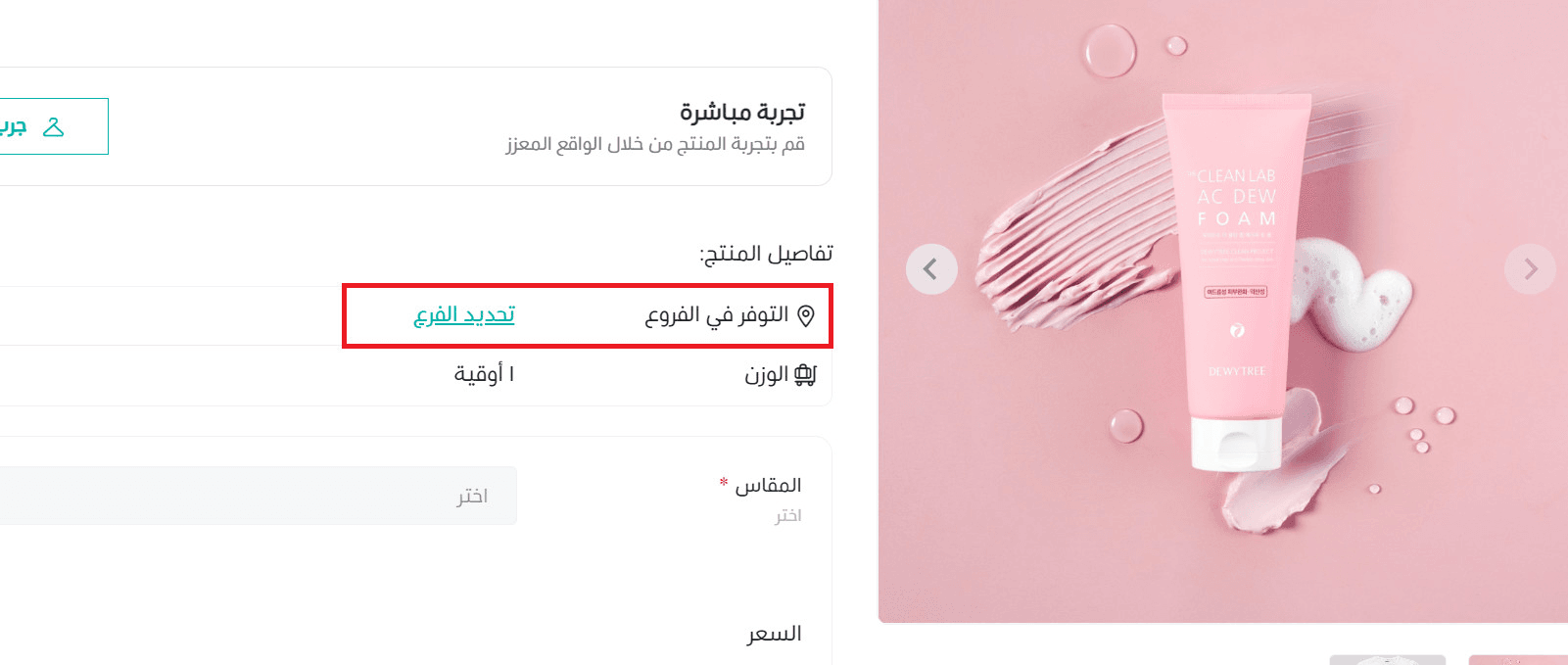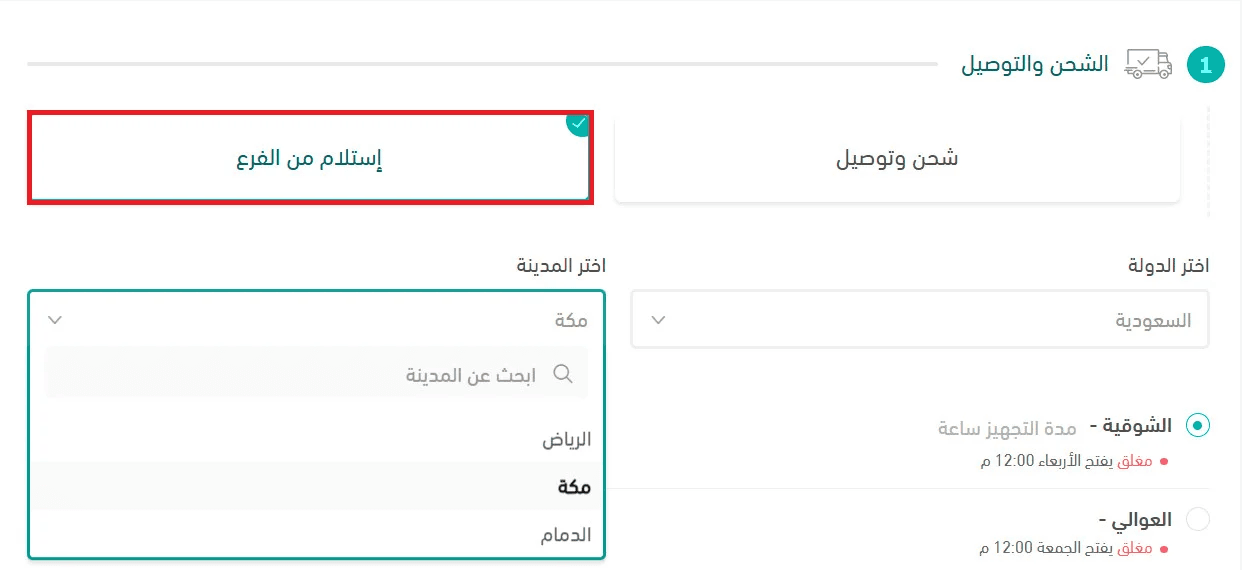 From the checkout page: The customer selects Pickup from Branch, then chooses the branch based on product availability and proximity.