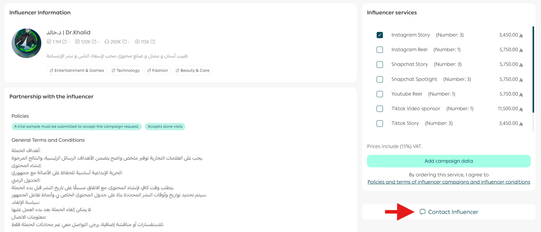 Follow these steps to contact an influencer directly before placing an order: