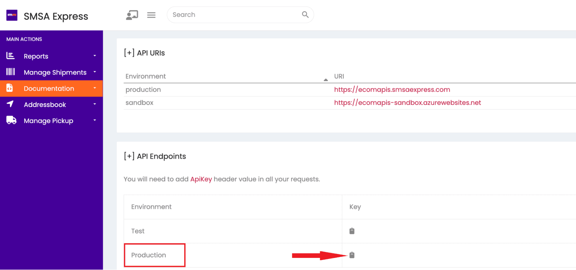 - Copy the Production API key shown in red.