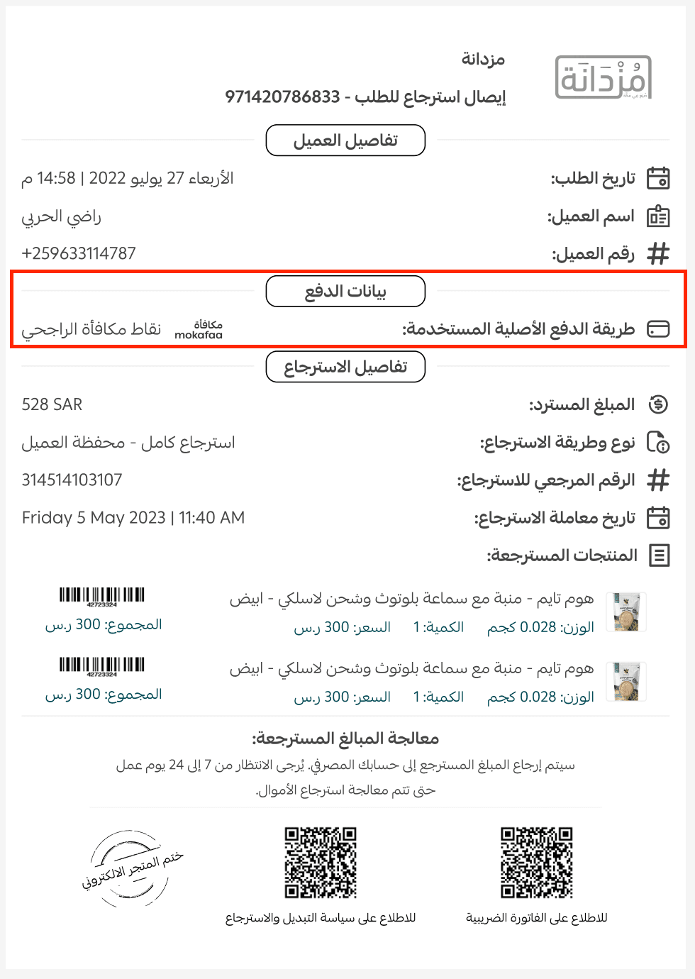 If an order paid with Al Rajhi Rewards is refunded: