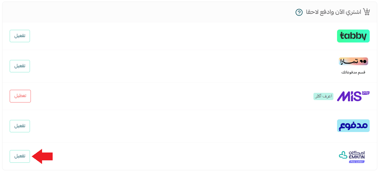 2. In the Buy Now, Pay Later section, find Emkan, then click Activate.