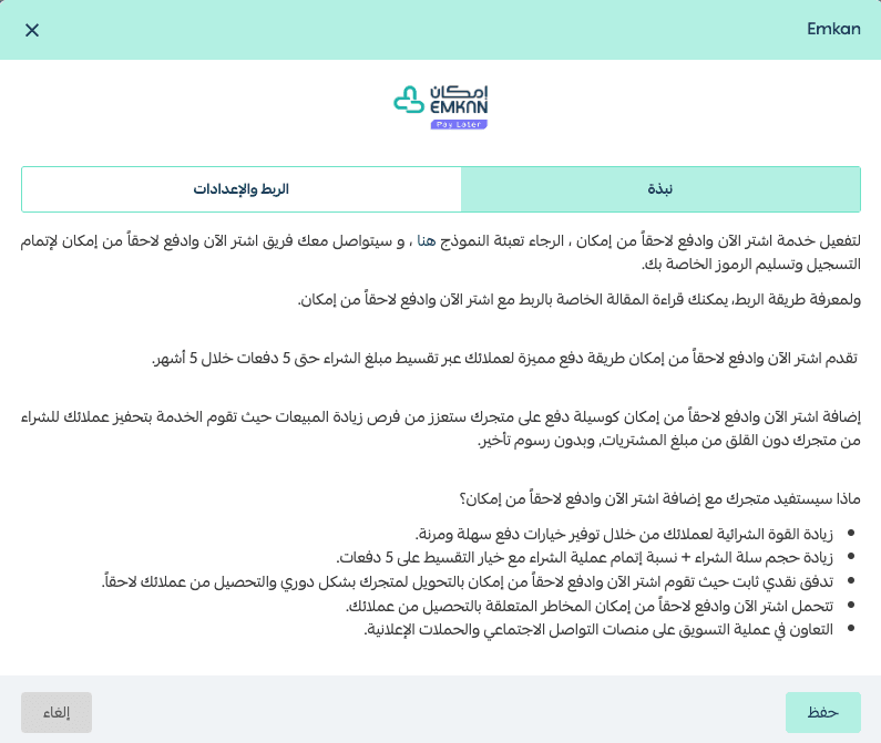 Emkan is a Buy Now, Pay Later payment method that allows merchants to activate the service directly through the platform and offer customers convenient installment options at checkout.