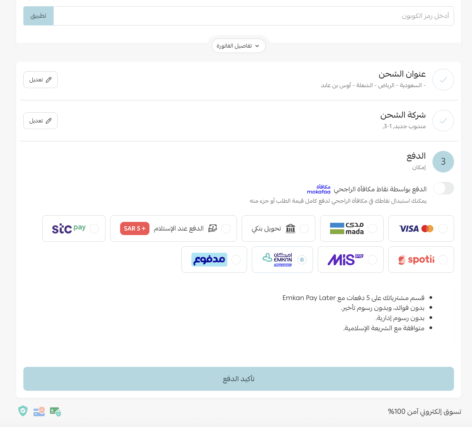 Emkan supports installment plans of up to 5 payments.