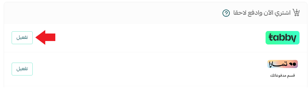 2. In the Buy Now, Pay Later section, find Tabby, then click Activate.