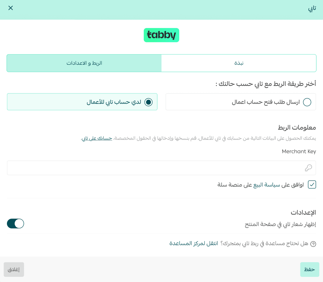 - Enter your Tabby Merchant Key