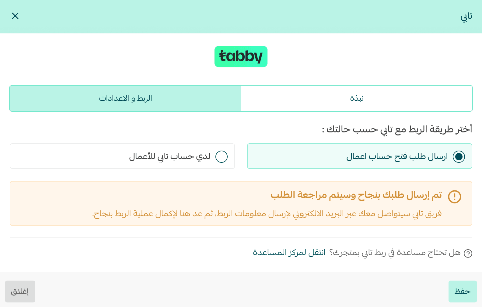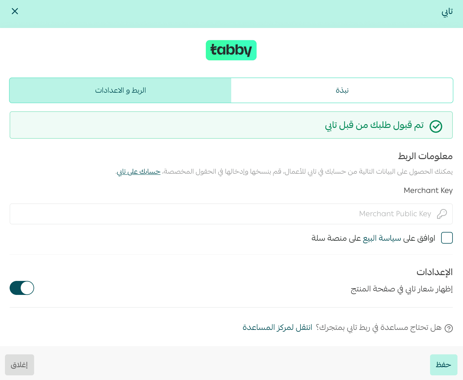 Once your request is accepted, Tabby will send you an email with your account details. You will also see a confirmation message on the Tabby settings page.