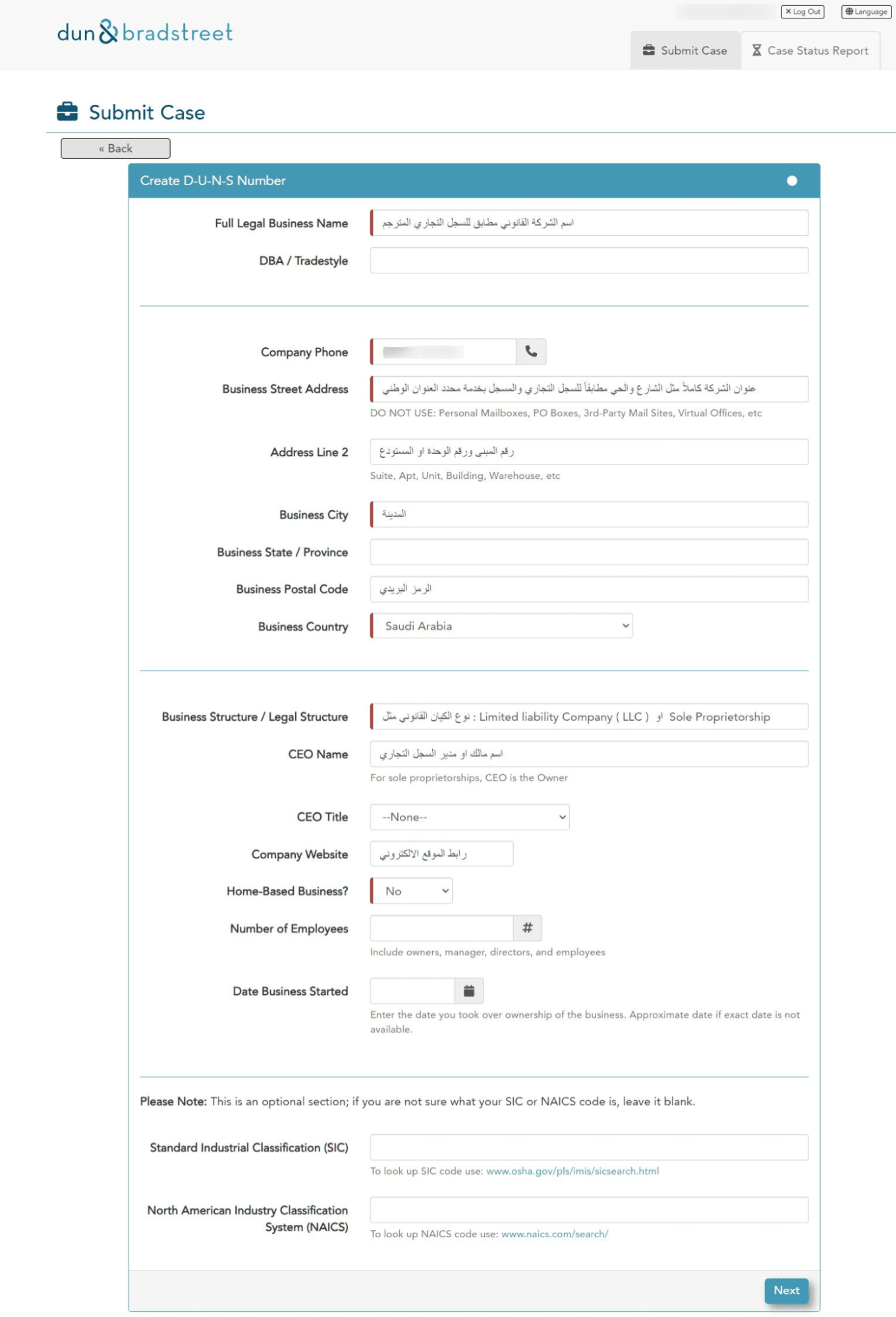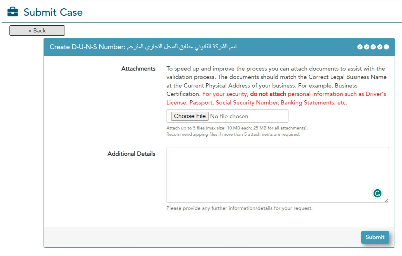 Fill in all required information exactly as listed on the commercial registration of the business, then click Submit.