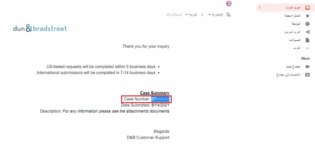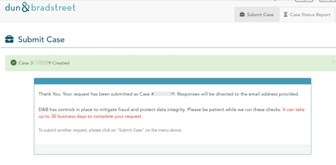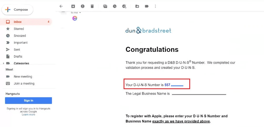 When the request is approved, you’ll receive an email confirming your new D-U-N-S Number, similar to the example shown.