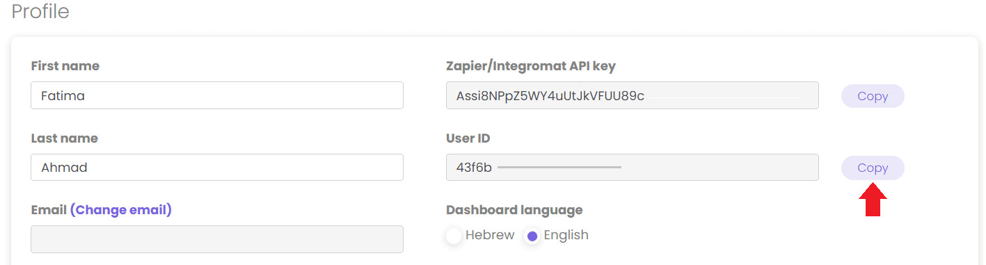 - On the Profile page, locate the User ID field and click Copy.