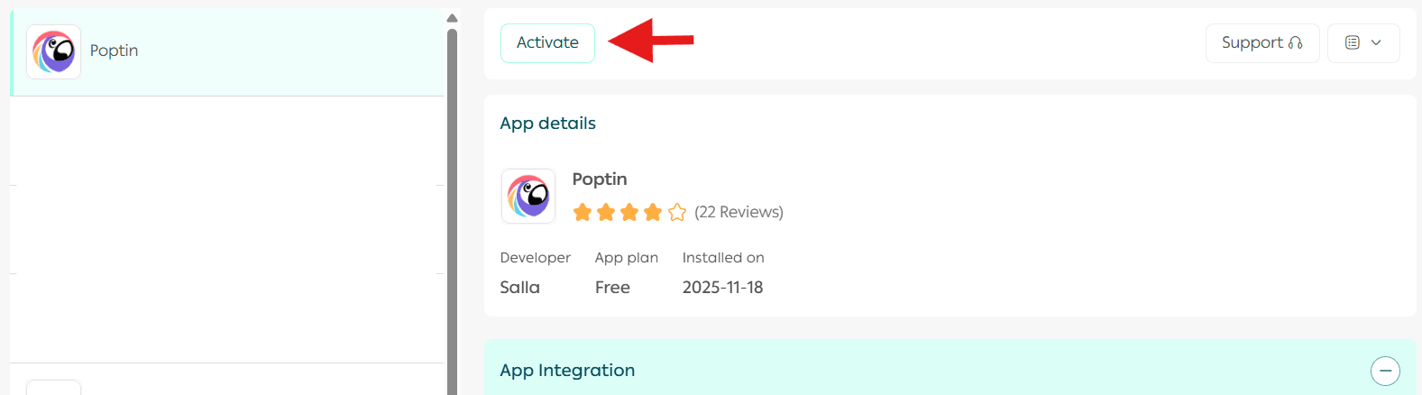 - From the installed apps page, locate Poptin and click Activate App.