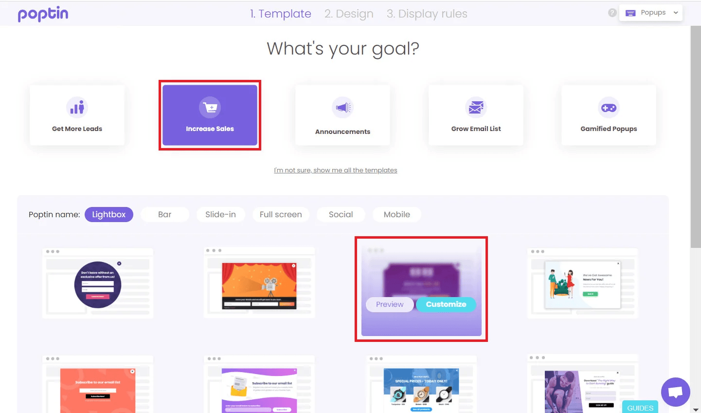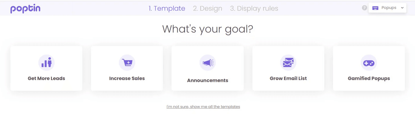 - From your Poptin account dashboard, choose your campaign goal (for example, Increase Sales), then select a template.