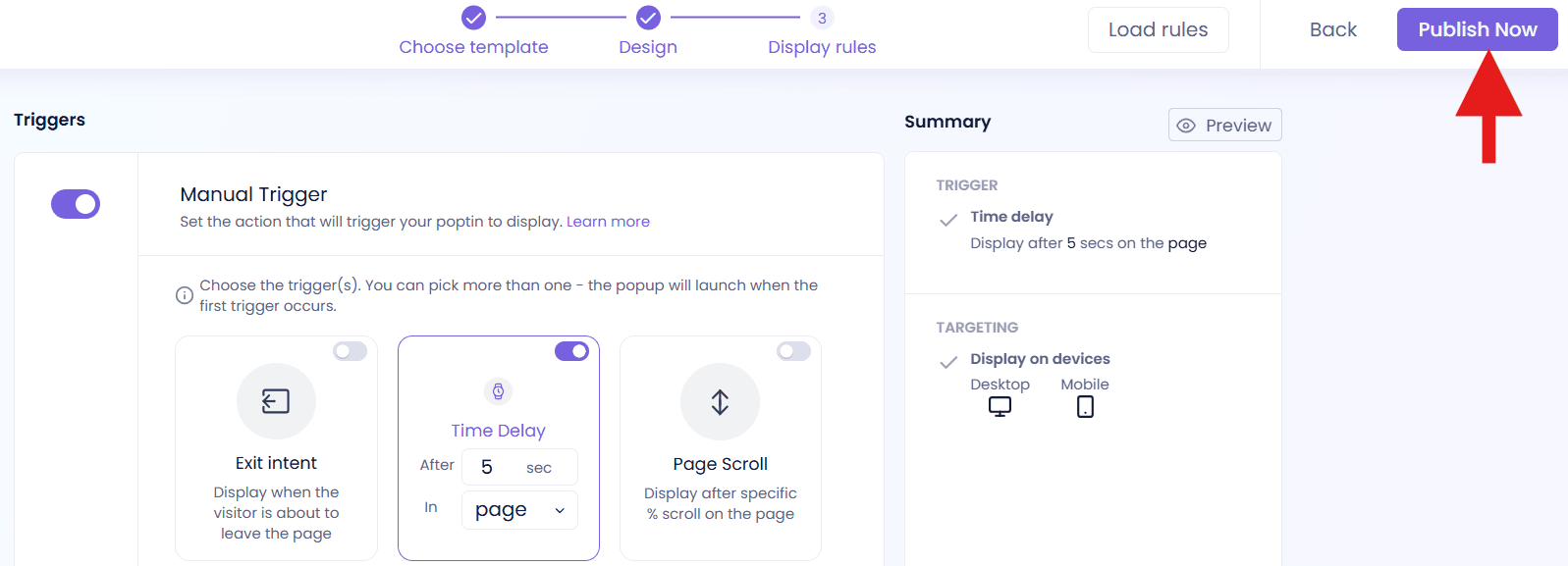 - Configure the triggers that control when the pop-up appears, then click Publish.