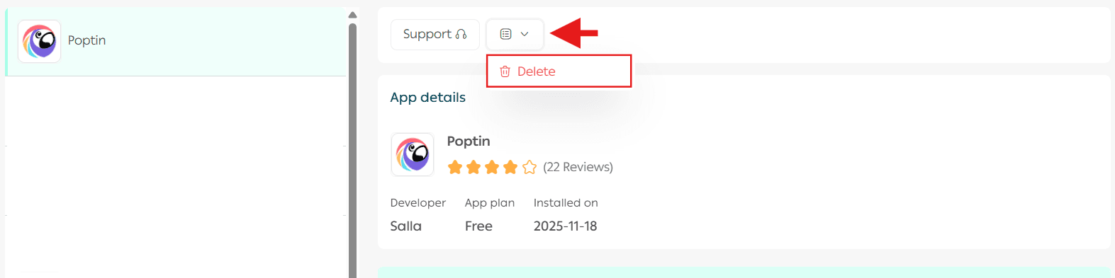 - Locate Poptin, click App Options, then select Delete App.